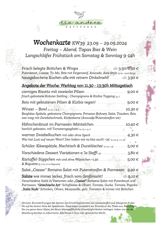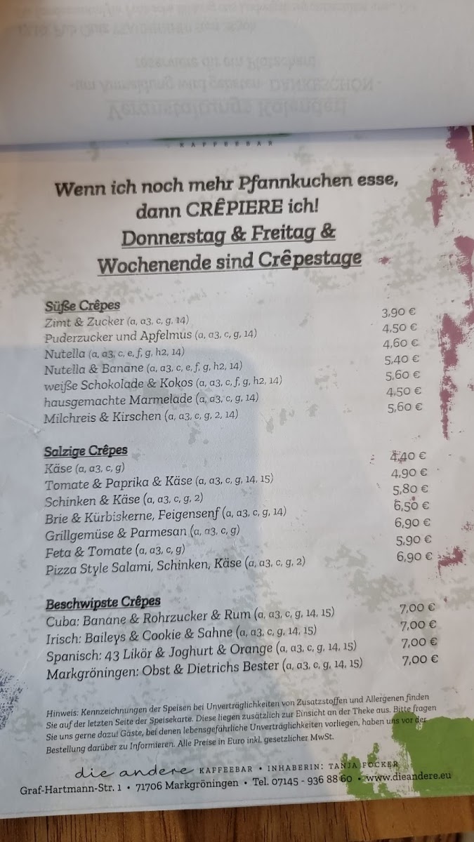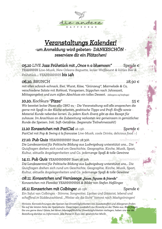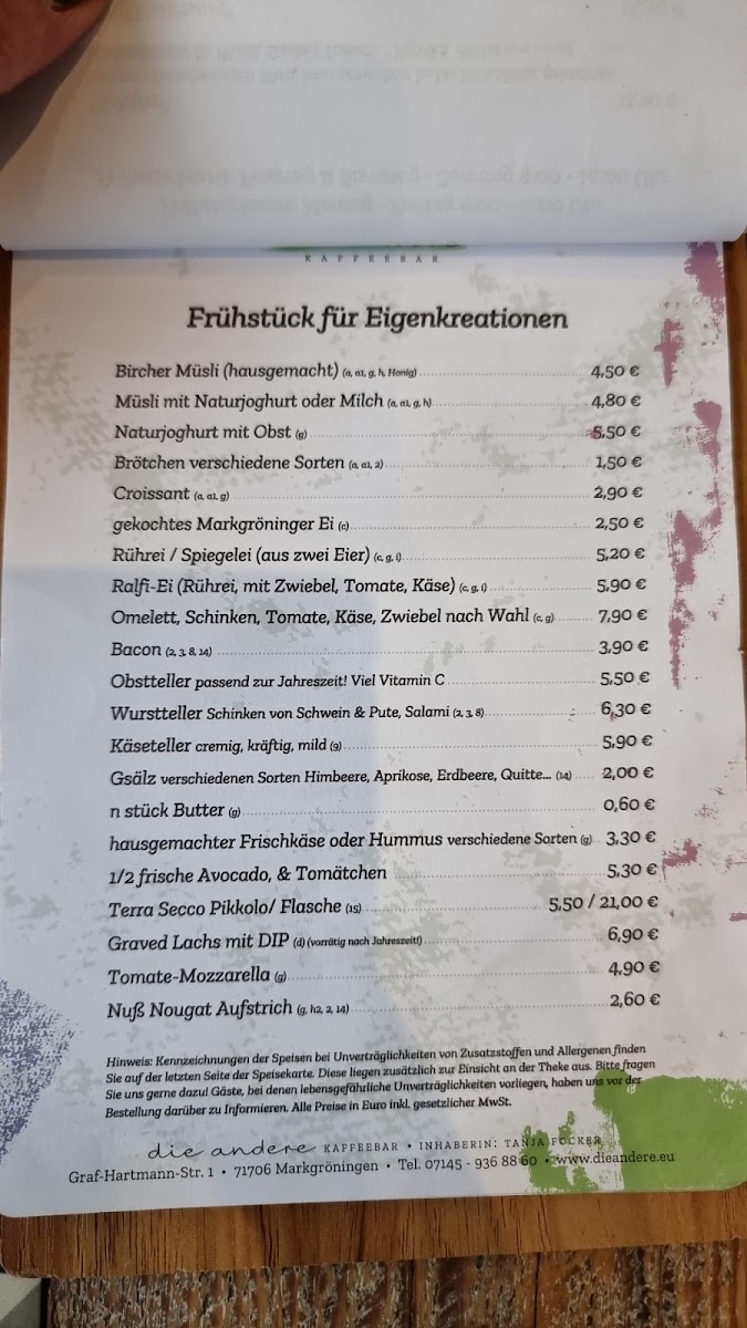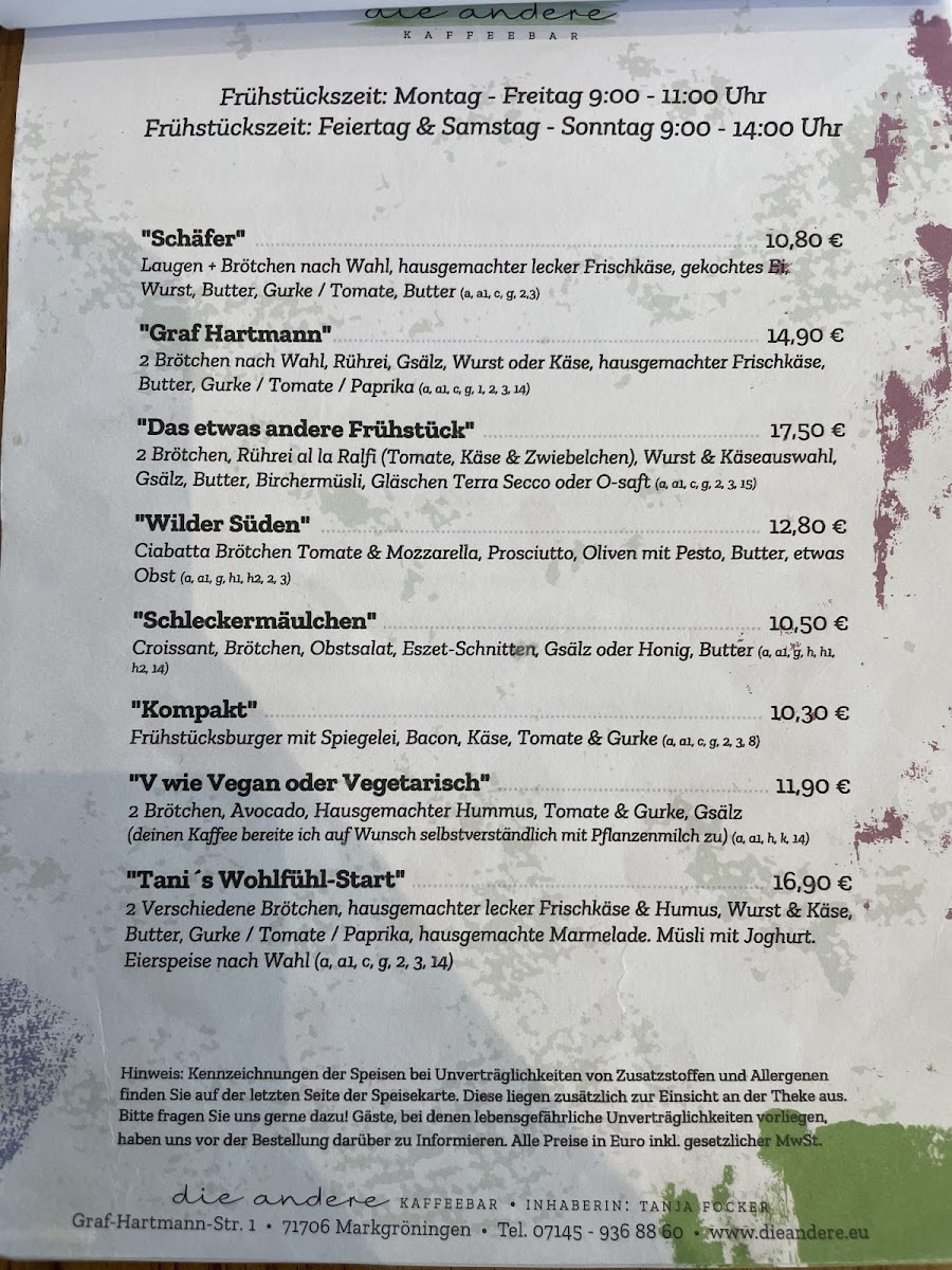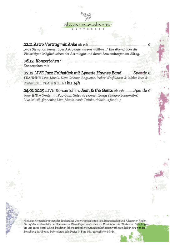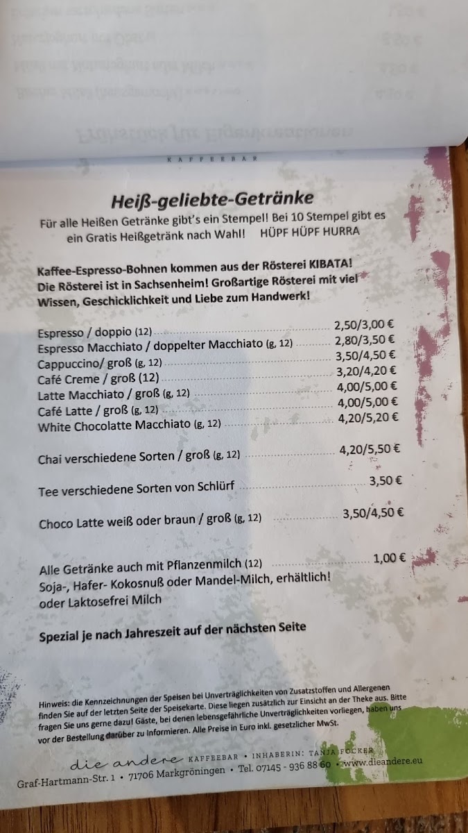 Welcome to die andere KAFFEEBAR, a charming café nestled in the heart of Markgroningen at Graf-Hartmann-Straße 1. Tanja Focker’s café is not just a place to grab a drink; it is an experience that envelopes you in warmth and joy the moment you step inside. This treasure of a café is where the inviting aroma of freshly brewed coffee meets a vibrant atmosphere filled with laughter and the soft sounds of live jazz.
